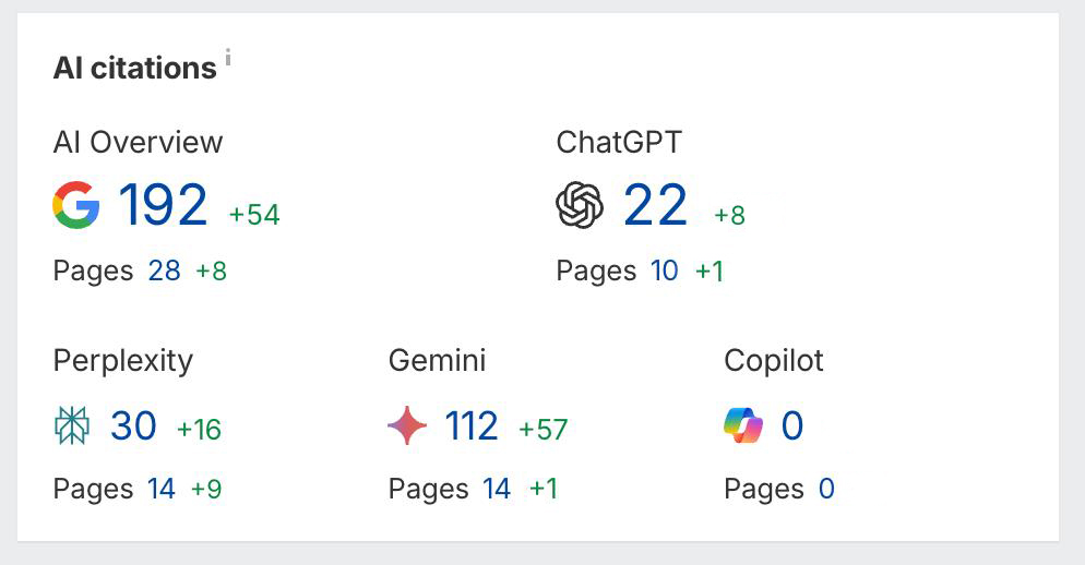 In Google AI Overview, total citations increased to 192, up by 54, while the number of cited pages grew to 28, up by 8.